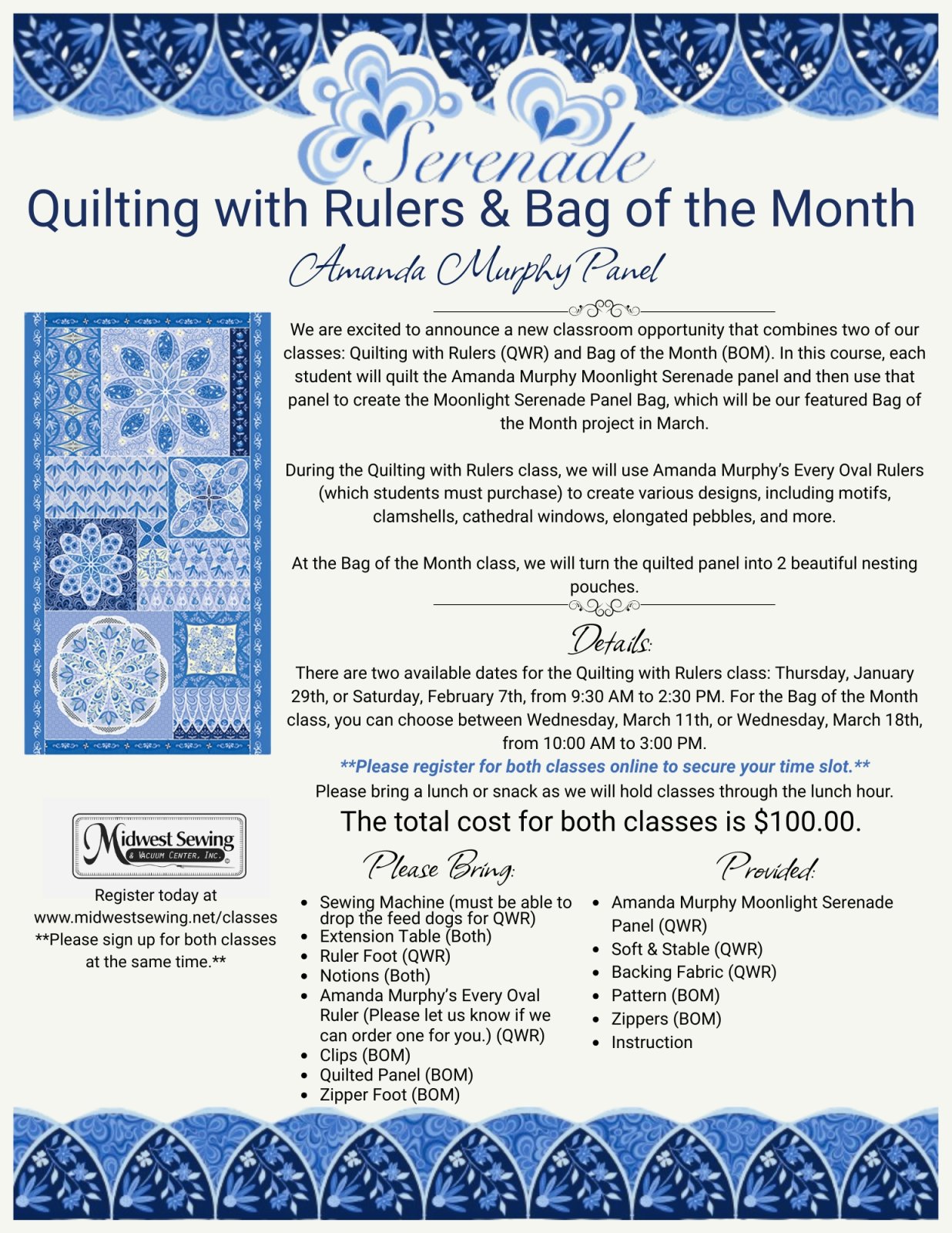 The $100 registration fee includes both class fees as well as all the fabric, stabilizer, and hardware needed to complete the bag. Students will need to purchase the "Every Oval Rulers" by Amanda Murphy separately, which we can order for you through the store.